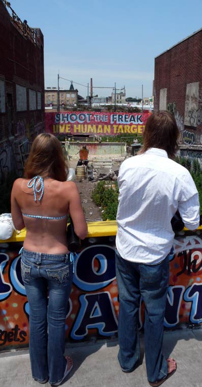 The closest thing to an old-time funfair stall: on a disused patch of ground between to buildings on the broadwalk – an opportunity to shoot paint pellets at a live human target. We asked why we should want to shoot at the quiet young man who was sitting there. The barker replied: ‘If you were down there, he would shoot you!’