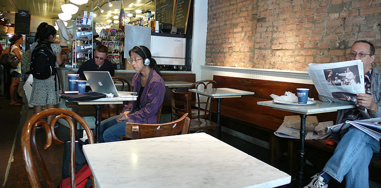 Donna Tsufura reviewing my editor’s demo reel in the local bagel shop. She’s come up with a clever addition that I’ll be working on over the next few days.