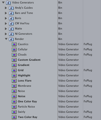 If you’d like more information on the generators installed when you install Motion, you can find more in the Motion manual. You can tell which generators are installed with Motion by looking at the Render generators. Those that use FxPlug technology came with Motion: