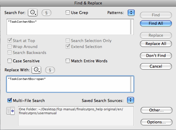 - 6. In a Finder window, navigate to where you created the copy of the FCP help system, navigate inside to “en/finalcutpro” and drag the “usermanual” icon to the “Multi-File Search” area.