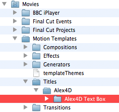 Expand the ZIP archive and add the folder to the Motion Templates folder in the Movies folder of your home directory. Create an Alex4D folder in the Titles sub-folder: