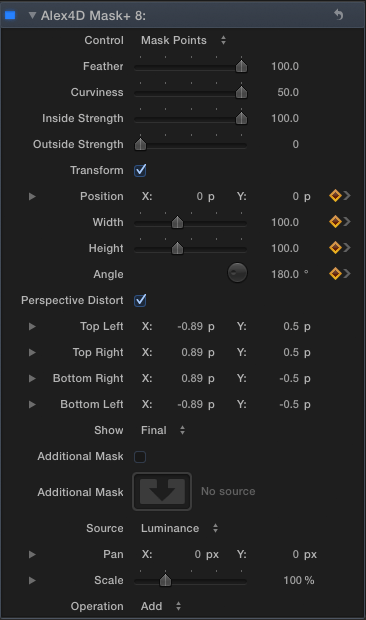 As well as being able to transform the mask, you can also control its perspective distortion. Note that the perspective controls don’t move the mask shape co-ordinate controls, so you must choose either to see the Mask Points control or the Perspective Distortion control.