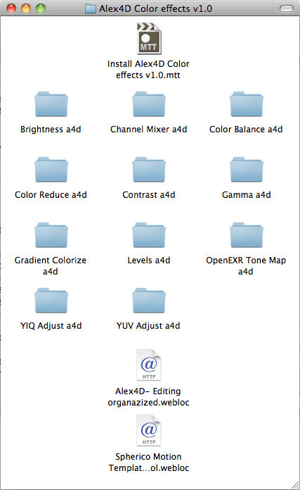 It includes an installation script for Spherico’s Motion Template Tool application, if you don’t have it on your Mac, download it. It is a freeware/donationware tool that simplifies effects installation for Final Cut Pro X users. MTT installs the effects in the correct folders, creating them if need be. You don’t need to have Motion 5 or MTT installed for these effects to work.
