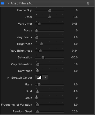 There is a version of Aged Film in Final Cut Pro X, but the version available in Motion has more controls. I’ve used that as the basis of Aged Film a4d: