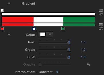 You can also edit the gradient so parts are transparent. Add opacity chips by double-clicking the top bar in the gradient, where white is 100% opacity and black is 0% opacity. You can also set the Interpolation for each opacity clip. This gradient has a gradual change in opacity between the first and second chips. The second chip is black and selected, which means the gradient will be transparent from that point on. As the Interpolation is Constant, the opacity will be 0% until the next chip.