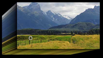 Alex4D Extrude takes the output of the scaled clip and simulates the effect of many copies of the clip are stacked on top of each other, with the back copy being offset by a distance and angle. You can enter numbers for Extrude Angle and Extrude Distance directly, or drag the on-screen control to set the values: