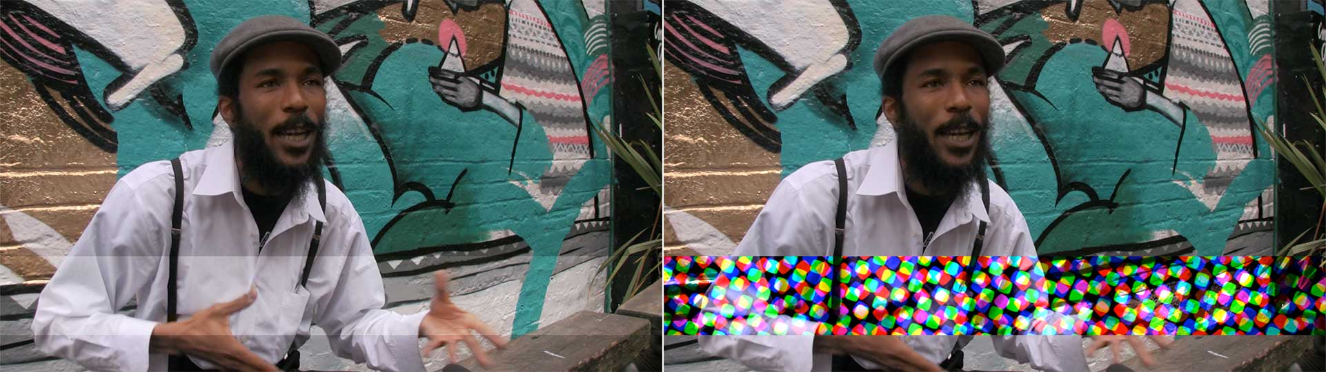 On the left you can see a semi-transparent grey solid that has been cropped to make a background for a lower-third. The right shows how the CMYK Halftone effect applied to the solid.